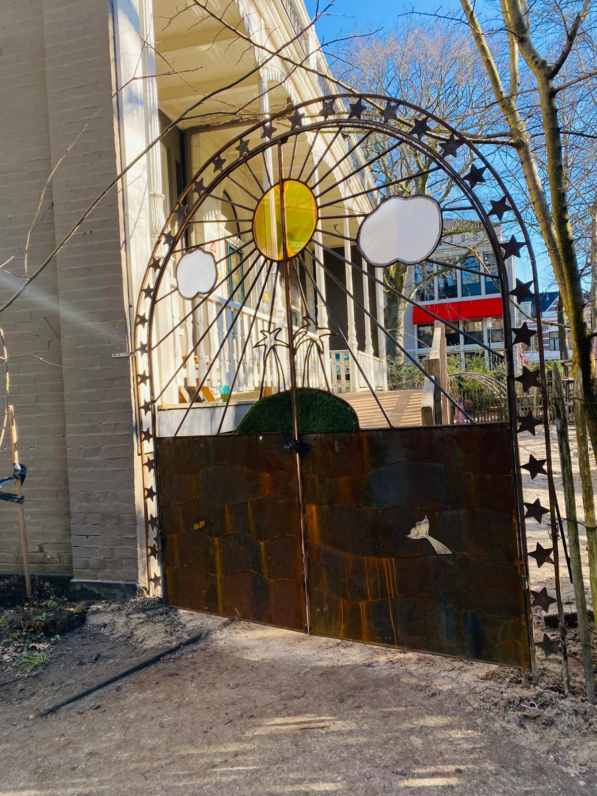 Na veel reparatie-rondes moest het oude hek nodig worden vernieuwd. Dus vroegen we de kinderen van de Buitenschool een aantal ontwerpen te maken en heeft William (www.kunsteboer.nl) er een kunstige poort van gesmeed.